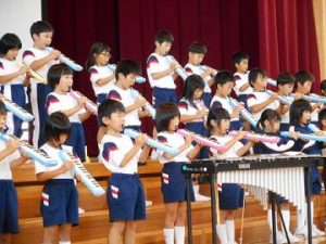 次に、1年生が鉄琴、トライアングル、トーンチャイム、ハンドベルで「星空の音楽」を合奏しました。