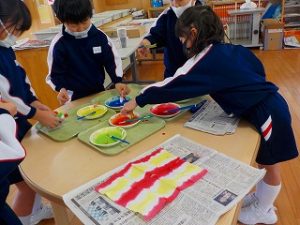 2年生 図工 2022年1月14日 2年 何度か折りたたんで四角形や三角形にした半紙の角や辺に、赤、青、黄色等、好きな色の絵の具を染みこませました。半紙をそっと広げると、いろいろな模様が出来上がっているので、子供たちは、紙を開くたびに「かわいい!」「不思議~」と歓声を上げていました。
