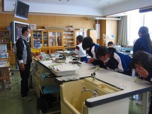 6年1組 理科 2022年1月19日 6年 「水溶液の性質とはたらき」の学習で、食塩水、石灰水、アンモニア水、塩酸、炭酸水の5種類の水溶液の違いを調べました。一つ一つのビーカーを順番に見て、色を見たり、においを嗅いだりしました。液中の水を蒸発させてどんなものが残るかについても実験しました。