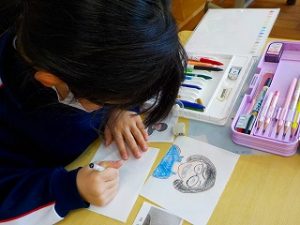 2年生 図工 2022年2月18日 2年 6年生を送る会で、2年生は、6年生へのプレゼントを担当しています。同じ地区で一緒に下校したり、運動会や集会でお世話になったりした感謝の気持ちを込めて、写真を見ながら似顔絵を描きました。紙皿に貼って首飾りにし、当日一人一人に渡す予定です。