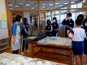6年生 図工 2022年10月18日 6年 黒部市美術館の出前授業で、ドライポイント版画をしました。前回、ニードルでアクリル板に傷を付けて小学校生活の思い出の品を描き、版を作りました。今回は、版にインクを乗せ、プレス機ではさんで印刷をしました。子供たちは、濃淡をイメージしながら工夫してインクの拭き取り、順番に刷り上げていきました。
