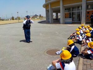 1・2年生 交通安全教室 2023年4月13日 1年, 2年, 学校行事 警察の方を招き、1、2年生の交通安全教室を行いました。道路を歩くときの交通ルールや、登下校時の安全な歩き方が身に付くために大切なポイントを教わりました。警察の方から交通安全のお話を聞いた後、外に出て学校周辺を安全に気を付けながら歩きました。