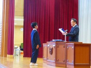 次に、各学年の代表者が返事をしてステージに上がり、校長先生から修了書を頂きました。