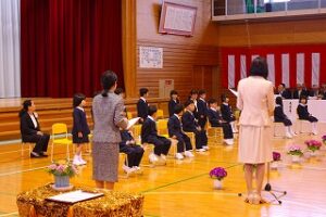 令和6年度入学式 2024年4月9日 学校行事 4月9日(火)、 第19回入学式が行われました。新入生は16 名が、緊張しながらも笑顔いっぱいで担任の先生の後について、体育館に入場しました。氏名点呼では、名前を呼ばれたら「はいっ!」と元気よく返事をしたり、校長先生やPTA代表様、6年生児童代表の挨拶にも「ありがとうございます」と伝えることができました。式の後は、登校の付き添い児童との対面式を行いました。明日から楽しく登校してほしいです。