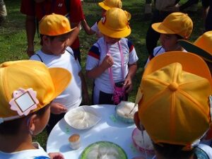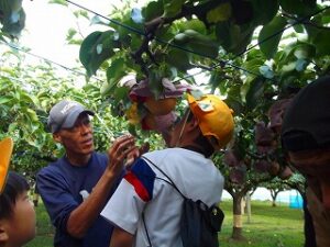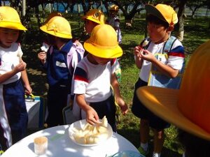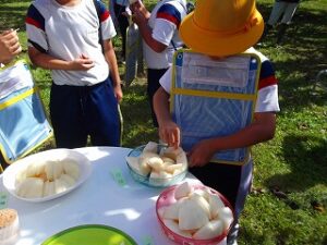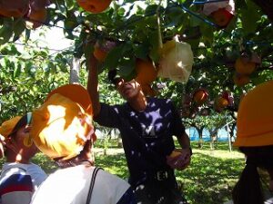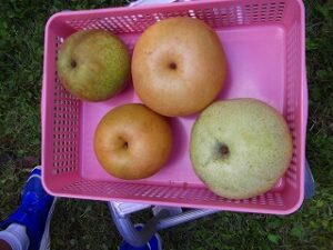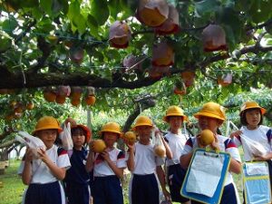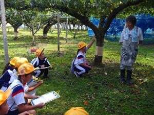 10月2日(木)に2年生が生活科「町たんけん」の学習で、宇奈月小学校の近くにある新興果樹園に見学に行きました。梨の品種4種類「新高」「かほり」「新星」「甘太」の食べ比べをさせてもらいました。子供たちは、梨に興味をもち、品種が何種類あるかを質問していました。