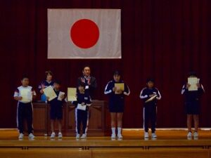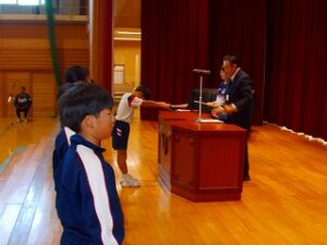 朝活動に、授賞集会がありました。黒部市発明くふう展の優秀賞、入賞、こつこつノート3冊、6冊、9冊達成者に賞状を渡しました。魚津市剣道大会の次勝、若鷲旗少年野球大会の参賞の紹介がありました。子供たちは、いろいろな方面で活躍しています。