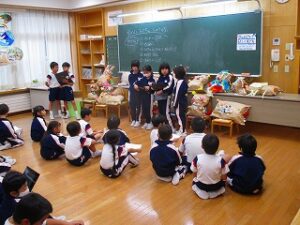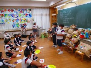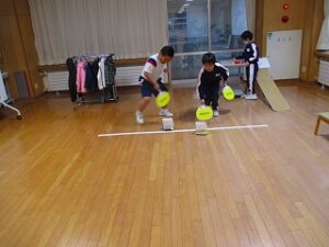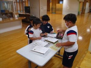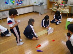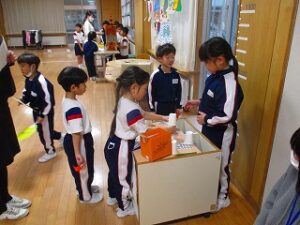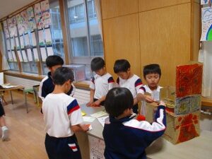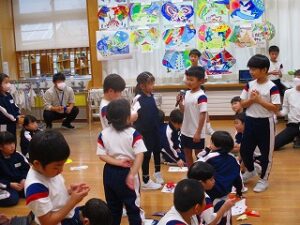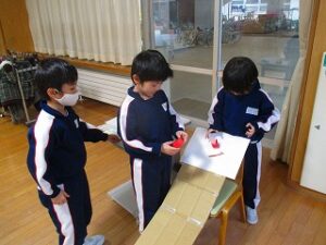3時間目に2年生が、「なかよし・おもちゃ集会」を開きました。1年生を招待して、「コロコロコロン」「トコトコ車」「ヨットカー」「めいろ」「ピョンコップ」「パッチンジャンプ」の6つのお店を作りました。どのお店も工夫してあり、1年生は、大喜びでした。