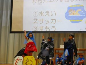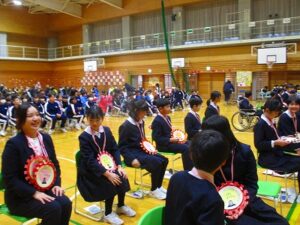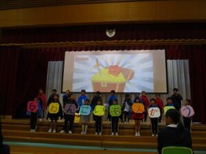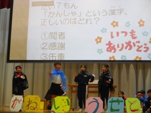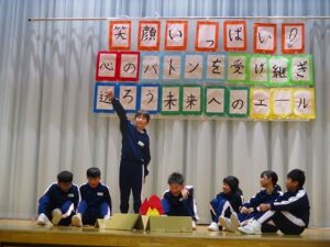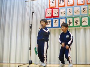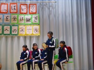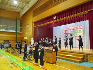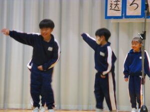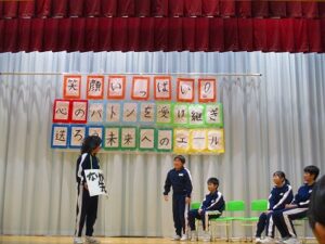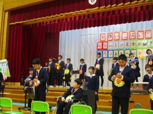 1、2時間目に安全パトロール隊感謝の集い・6年生を送る会がありました。日頃お世話になっている安全パトロール隊や駐在さん等に6年生の代表がお礼を言いました。6年生を送る会では、1年生はパフォーマンス、2年生は首飾り作り、3年生はクイズ劇、4年生は招待状作り、5年生は企画運営・思い出劇、6年生は東京スカパラダイスオーケストラ「Paradise Has No Border」の合奏をしました。どの学年も、6年生に感謝する気持ちがこもっており、温かい気持ちになる集会でした。多数参観してくださった地域の皆様、保護者の皆様、ありがとうございました。