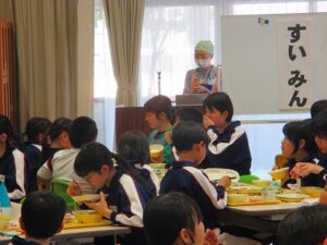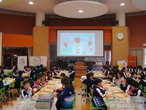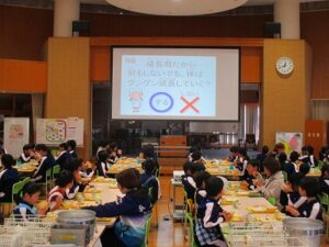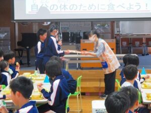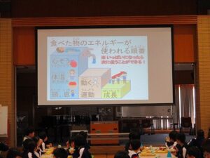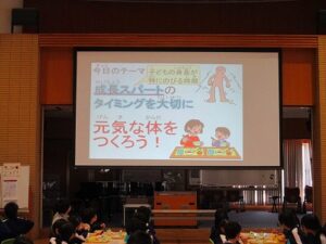 給食センターの石橋栄養教諭さんから、「成長スパートのタイミングを大切に」という話をしていただきました。成長するには、「バランスよく食べること」「運動すること」「ねること」の3つが大切であると話をされました。子供たちの心に残るお話でした。石橋先生の話は今年度最後だったので、子供たちのメッセージを手渡しました。