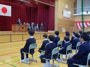 始業式では、校長先生から「さわやか すがすがしい 気持ちのよい毎日を過ごせる学校にしていきましょう。そのために、玄関の靴をそろえることとトイレのスリッパをそろえることをしっかりとできるようになってほしい」という話がありました。