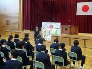 次に、生徒指導主事から安全な学校生活について「安全・安心・あさがおさいた」の三つの「あ」をこころがけていきましょう。」という話がありました。最後に、担任発表がありました。